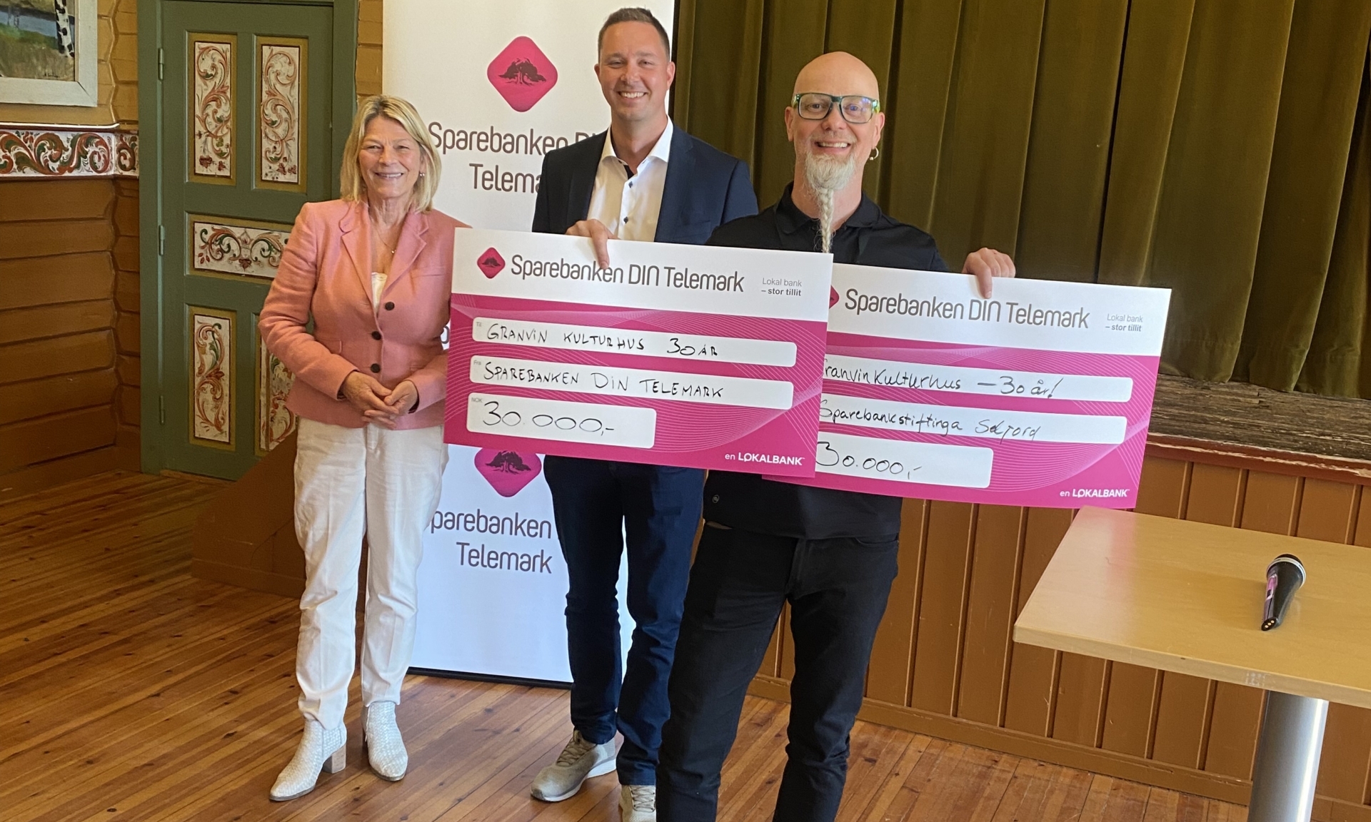 Og så var vi så heldinge å få med oss Sparebanken Din Telemark, til å gje ei ekstra gåve til Granvin Kulturhus sitt 30 års jubileum, så då vart det overrekt to sjekkar på kr. 30.000,- kvar til dagleg leiar Geir Jenssen.